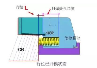 優點為加工方便,定位安全。常用于在x、y方向的行位,行程小的行位。彈簧的計算:首先要知道行位彈簧的預壓是說它在開完模走開扣位的情況下還有預壓,它的目的通過預壓產生的彈力來克服行位的重力不讓它往回走。