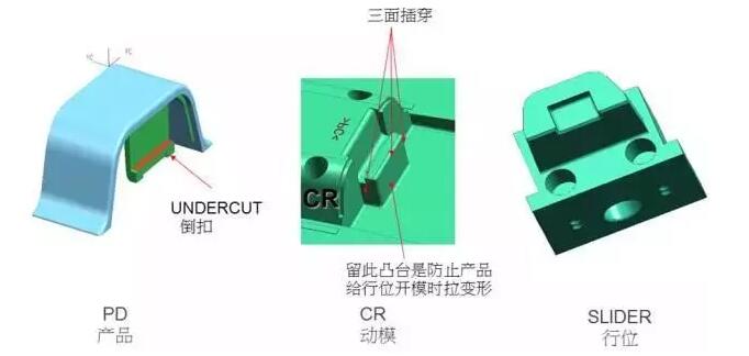 在塑料模具中,利用成型的開模動作,使斜撐梢與滑塊產生相對運動趨勢,使滑塊沿開模方向及水平方向的兩種運動形式,使之脫離倒勾。如下圖所示: