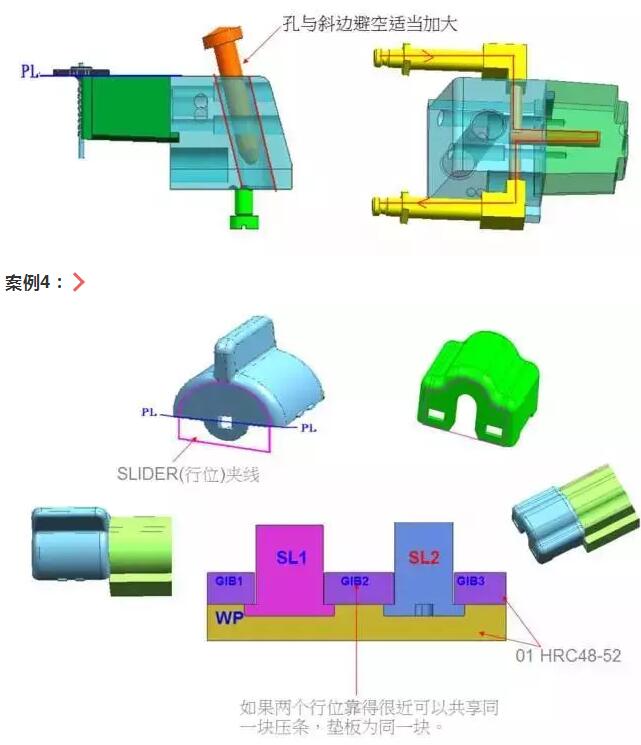 為了防止產品粘前模所以設計行位延時開模,前后模已打開一部分但是行位還沒有滑動,通過行位把產品夾住(有扣位)保證產品在后模。產品柱子大部分在行位上,所以行位要設計運水冷卻!