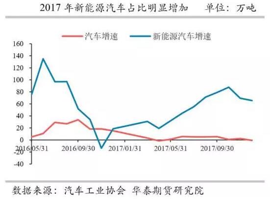 2017年,新能源汽車產銷均接近80萬輛,分別達到79.4萬輛和77.7萬輛,同比分別增長53.8%和53.3%。2017年新能源汽車市場占比2.7%,比上年提高了0.9個百分點。由于新能源汽車在節約能源有著非常大的優勢,因此近幾年新能源汽車行業擴張迅猛,并且對鋁制汽車部件的需求增長激增。相較于傳統汽車,新能源汽車采用電池作為動力驅動汽車,因而動力受電池重量、動力電池續航里程的制約,因此車身減重比傳統汽車更顯迫切,因此預計鋁合金材料的用量更大。