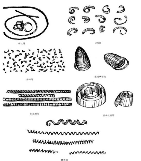 以上是四種典型的切屑,但加工現(xiàn)場獲得的切屑,其形狀是多種多樣的。在現(xiàn)代切削加工中,切削速度與金屬切除率達到了很高的水平,切削條件很惡劣,常常產(chǎn)生大量“不可接受”的切屑。