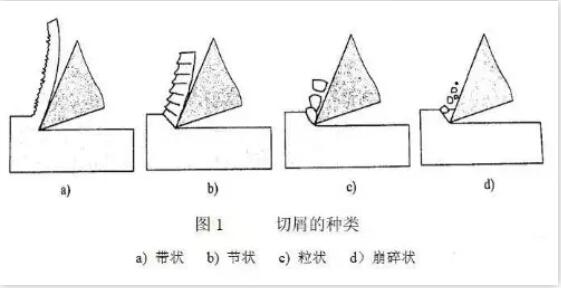 由于塑性變形程度的不同,可能會產生不同種類的切屑,如圖1所示。加工塑性材料時,主要形成帶狀切屑、節狀切屑或粒狀切屑,加工脆性材料時,一般形成崩碎狀切屑。