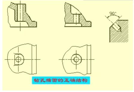 用鉆頭鉆孔時,要求鉆頭軸線盡量垂直于被鉆孔的端面,以保證鉆孔準確和避免鉆頭折斷。三種鉆孔端面的正確結構。