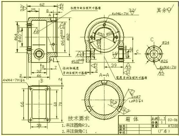 在標注尺寸方面,通常選用設計上要求的軸線、重要的安裝面、接觸面(或加工面)、箱體某些主要結構的對稱面(寬度、長度)等作為尺寸基準。對于箱體上需要切削加工的部分,應盡可能按便于加工和檢驗的要求來標注尺寸。