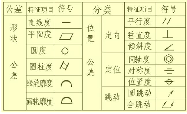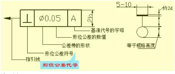 形位公差代號包括:形位公差各項目的符號,形位公差框格及指引線,形位公差數值和其他有關符號,以及基準代號等。框格內字體的高度h與圖樣中的尺寸數字等高。