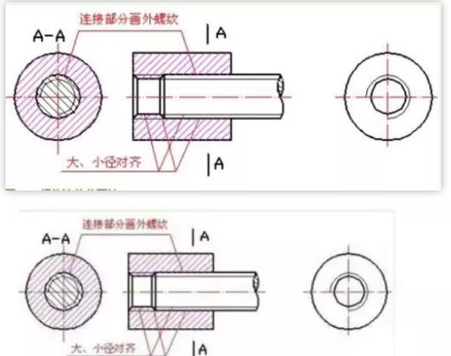 如圖4表示裝配在一起的內、外螺紋連接的畫法。國標規(guī)定,在剖視圖中表示螺紋連接時,其旋合部分應按外螺紋的畫法表示,非旋合部分仍按各自的畫法表示。