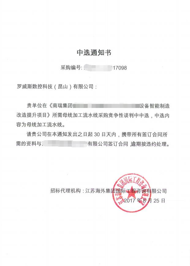 2017年8月25日,經過公司各級領導及投標人員的多方努力,我公司在南瑞集團母線加工流水線項目招標中一舉中標。過硬的產品品質、雄厚的技術實力、合理的價格、誠實守信的經營方式、完善的服務體系是我們勝出的理由。